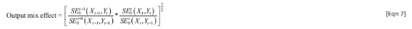 Equation 7 expresses that the alteration in the output mix effect is derived as a geometric mean of scale efficiency (SE) concerning the previous period's production technology and scale efficiency concerning the current period's production technology. The output mix effect quantifies the impact of a shift in the composition of output on the scale efficiency for the given period. This measurement can take the form of on (indicating an increase in the output mix effect), less than 1 (suggesting a decrease in the output mix effect), or exactly on (indicating no change in the output mix).