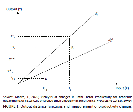 Figure 1 illustrates output distance functions and the measurement of productivity change. In this figure, and represent the production functions or technologies for periods t-1 and t, respectively. The decision-making unit operates below its technological frontier in both periods, situated at point A in period t-1 and point B in period t, indicating inefficiency. Performance measurement studies have identified various factors that contribute to improving TFP growth.