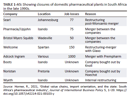 Fourthly, domestic firms struggle to compete with foreign firms, leading to declining domestic manufacturing. This trajectory is evident in South Africa, as an estimated nine plants closed down in the late 1990s because more companies opted to import rather than produce (Table 1-A5). On a global scale, the South African pharmaceutical sector is positioned as an end market for the sale of products produced elsewhere through the global value chain (GVC) rather than as a site of manufacturing (Horner 2021). As such, South Africa should carefully manage its trade relationships in this sector and strike a balance between imports and exports to maintain a certain level of domestic production and self-reliance.