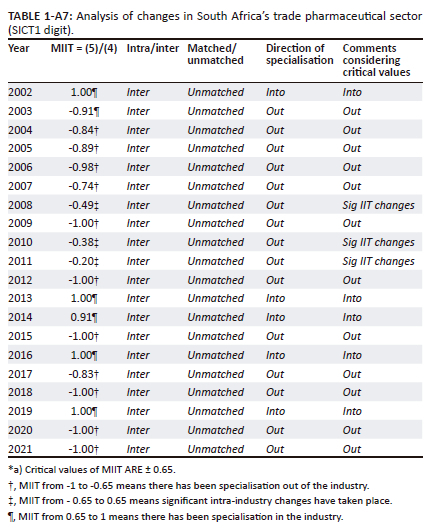 The MIIT and UMCIT results showed that new trade is inter-industry and specialisation is often out of the industry. This finding confirmed the popular view in the literature that intra-industry trade is more prevalent in developed than developing countries. However, while trade was found to be largely inter-industry, there was evidence of significant intra-industry changes in 2008, 2010 and 2011 and periods of industry specialisation in 2002, 2013, 2014, 2016 and 2019. As highlighted in the 'Analysis of results' section, these two findings revealed three crucial insights about the South African pharmaceutical industry.