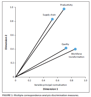 We employ a heterogeneous configuration to obtain a two-dimensional image of our data, our methodological approaches were performed with this limitation in mind, discrimination measures (Table 5 and Figure 1) display that all the values obtained from dimension one are above the value of ≥ 0.5 (Table 5), and in dimension two only two values were below the value 0.5 that is quality with a distinction of 0.416 and 0.403 (workforce transformation). The most discriminant variables for dimension one hierarchically were workforce transformation (0.848), quality (0.716) and productivity 0.689, with supply chain being the least discriminant at 0.520. The most discriminant variables for dimension two hierarchically were productivity (0.975) and supply chain (0.825) (Table 5). The most discriminant variables in both dimensions are productivity and supply chain management.