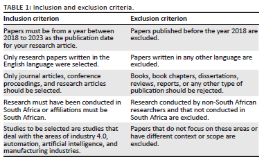 The data in this research article were obtained from qualitative research publications presented in reputable journals and conferences. Studies were selected for their relevance to the research topic and for the purpose of multiple correspondence analysis aimed at examining the impact of AI on multiple parts of an industrial process. The articles were found by searching keywords 'Impact of Artificial Intelligence on the South African Manufacturing Industry' on ScienceDirect, Scopus, Springer, Web of science, and Google Scholar. Search results were filtered by publication date and article type (review articles and research articles). Twenty-three articles covering AI and different aspects of the manufacturing process in South Africa (Supply chain management, productivity, workforce transformation, quality control) were selected. Only publication from the year 2018 to the year 2023 were included in the study to ensure that the study incorporates the most recent, relevant and highest quality research, reflecting the latest technological advances, industry practices and policy contexts. As depicted in Table 1, an inclusion and exclusion criterion was formulated as they are important when selecting data from publications as they help to define the quantity and quality of evidence relevant to the research question. It also helps to eliminate biases and confounding factors that could affect the outcome of a study.