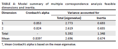 The goal of MCA is to arrive at a solution where objects in the same category should be drawn closely together, and objects in different categories should be shown widely apart, according to the MCA solution. Every object is as near as feasible to the relevant categories' category points. When variables group objects into the same subgroups within the same categories, they are said to be homogenous (Olugbara et al. 2021). In order to maximise the overall spread for a one-dimensional solution, MCA allocates appropriate scale values (category quantifications) to each category of each variable. Multiple correspondence analysis discovers a second set of quantifications for a two-dimensional solution that are unrelated to the original set. Additionally, MCA provides scores for things; the averages of the item scores within a category serve as the quantifications for that category (Epizitone & Olugbara 2020).