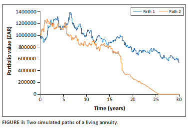 As a preliminary analysis, we illustrate what the value of a living annuity may look like for two different random paths over 30 years, assuming an annual withdrawal rate of 6%, an initial investment amount of R1 million, and equal weights invested in bonds and equities. We perform the analysis over a period of 30 years given that the conditional median life expectancy, starting from age 60, is 82 years old.