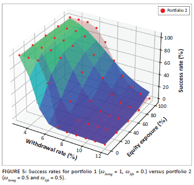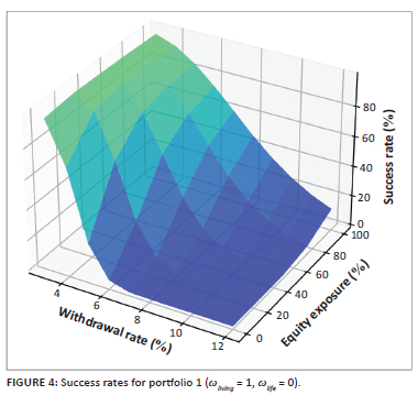Figure 4 illustrates the success rate for varying asset allocations and withdrawal rates for Portfolio 1.
