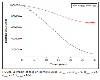 To illustrate the impact of fees on a living annuity, we consider a pure living annuity with an annual drawdown rate of 6% and equal weights in bonds and equities. We plot the average portfolio value over 10 000 simulations, including and excluding fees. Figure 6 shows that the impact of fees cannot be ignored as the portfolio value erodes significantly faster. The average value of the portfolio without fees is approximately R680 000 with a success rate of 57%. However, once fees are introduced, the portfolio value decreases to approximately R120 000 after 30 years, with a success rate of just 20%.
