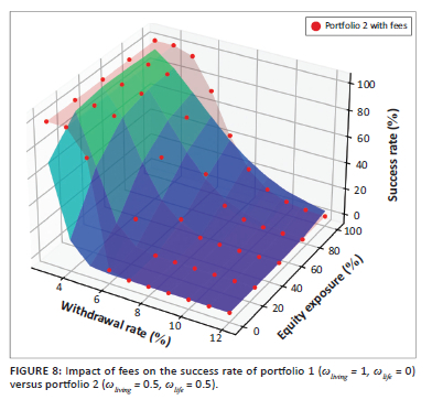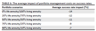 Table 6 indicates that the success rates of retirement portfolios, which have a high percentage invested in a living annuity, are, on average, affected more by portfolio management costs (Table 1). This is mainly because of the nature of the retirement products, where living annuities have annual management costs and life annuities only have once-off costs at inception.