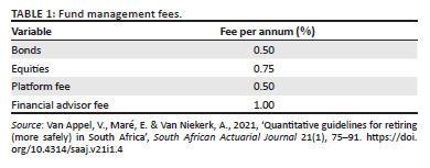 In managing a retirement portfolio, it is common for institutions to charge various fees, including advisor fees, fund management fees and platform fees, which can significantly affect the portfolio's success rate; it is thus a crucial consideration for retirement planning. We consider the fee structure as seen in Table 1 for the living annuity by Van Appel et al. (2021).