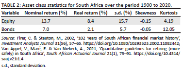 The value of a living annuity is dependent on asset class returns, whereas a typical living annuity portfolio consists of a risky asset (equity) and a 'safe' asset (bonds). We highlight summary statistics for South African bonds and equities for the period from 1900 to 2020 in Table 2, which is based on data sourced from Firer and Stauton (2002), Dimson, Marsh and Staunton (2016), and Van Appel et al. (2021).