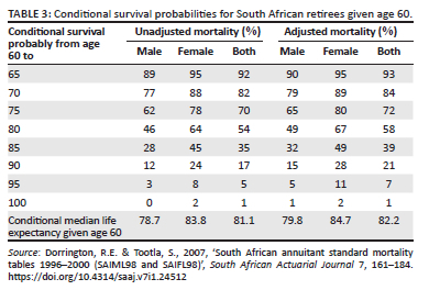 The value of a life annuity is dependent on the age of the insured, mortality rates and interest rates. We assume that the average retirement age in South Africa is 60 and derive conditional survival probabilities from the South African life tables for assured lives (Dorrington & Tootla 2007:161-184).