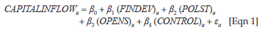 Where i and t represent countries and time, respectively, FINDEV is financial development (Gross fixed capital formation as per cent of GDP, gross savings), POLST political stability index, OPENS capital openness index and inflation variable, and ε is the error term.