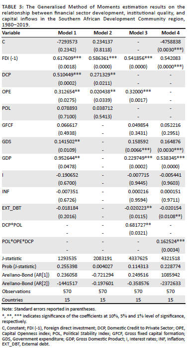 RESULTS: The findings from the study indicate that FSD and financial openness are important factors determining the flow of FDI to the SADC region. On the other hand, the effect of institutions was found to be significant when taking into account the state of FSD and financial openness