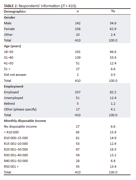 The demographic information of the sample is summarised in Table 2. About 63% of the respondents were female. Most of the respondents were aged between 18 and 30 years (46.6%), followed by those aged between 31 and 40 years (33.9%). Respondents older than 50 years of age accounted for 6.6% of the sample. In respect of occupation, 82.2% of the respondents were employed. Respondents completing the 'Other' category were students, part-time workers and self-employed individuals, while 51 (12.4%) of the respondents were unemployed, mainly explaining why 27 respondents (6.6%) indicated that they did not have disposable income at the time of the study.