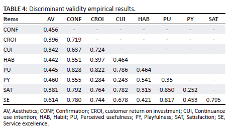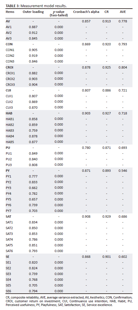 The construct validity of the measurement model was assessed by investigating the construct measures' convergent and discriminant validity, as Hair, Ringle and Sarstedt (2011) established. The standard criteria for convergent validity were applied, which are: (1) all standardised loadings (in PLS, outer loadings) are statically significant at 0.7 or higher; (2) the average variance extracted (AVE) of each construct is 0.5 or higher; and (3) the composite reliability (CR) value is 0.7 or higher. In assessing the discriminant validity, the Heterotrait-Monotrait ratio (HTMT) of correlations was evaluated (Henseler, Ringle & Sarstedt 2015). The evidence of discriminant validity is a ratio of less than 0.85 between the two factors (Henseler et al. 2015).