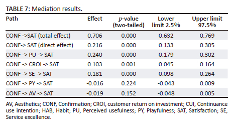 The in-sample predictive accuracy of continuance use intention was moderate (R2 = 51.8%). The model explained 69.1% of the variance in respondents' satisfaction with using a mobile app to purchase products - thus also yielding moderate predictive accuracy. The confirmation of the expectations of using a mobile app to purchase products explained the most variance in the service excellence dimension of EV (46.6%) followed by CROI (39.5%); aesthetics (15.6%) and playfulness (11.8%) showed a weak predictive accuracy by confirmation perceptions.