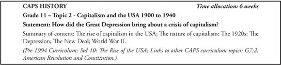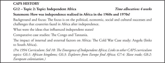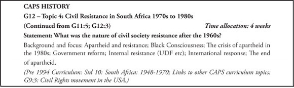 My intention below is to review the CAPS history curriculum for Grades 10-12 with the above reservations in mind. Due to lack of space I will only compare the content selection with the pre-1994 history curriculum and will not refer to the various articulations of the curriculum since 1994 related to Curriculum 2005 (1997) and the Revised National Curriculum Statement (RNCS, 2000).