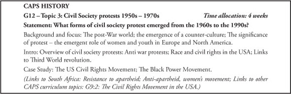 Over half of the Grade 12 curriculum is comprised of material that is on the margins of a definition of historical knowledge that is suitable for study at this level if we are serious about providing young people with the skills and forms of understanding that are characteristic of the field of history. Only Topics 1 (Cold War) and 2 (Independent Africa) provide students with the confident possibility of getting into a mature historical literature, or provide the possibility of a teacher being prepared or resources being available. Topic 3 (Civil society protest) is extremely interesting and links many themes relevant to Topics 1 and 2 of the South African section, but I am concerned about the depth of teacher knowledge and the availability and quality of resources.