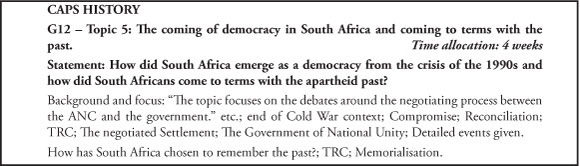 A key issue for consideration in relation to the South African contemporary history for Grade 12: Topic 4,5, and 6 is the difficulty of dealing with the balance between what we would like young people to know about the recent past and our ability or capacity to teach these topics with any degree of depth, distance or objectivity.