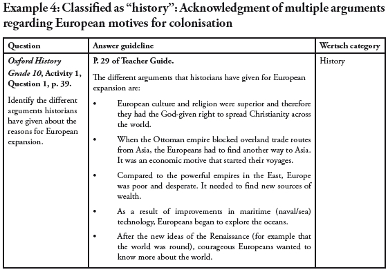 The distribution of answer guidelines is significant, as textbook chapters can only have a limited number of assessment activities, and the types of answers expected, and thus the cognitive skills developed when producing these answers, can have a profound ideological impact. The Teacher Guides for Oxford and Viva contained a noticeably greater prevalence of Wertsch's history category than did the Focus Teacher Guide. The quality of the answer guidelines also differed. In the Oxford and Viva Teacher Guides, more effort was made to provide answer guidelines that demonstrated development of thought through the expression of opinion and the provision of substantiation. Yet many of the Focus answer guidelines were skeletal and prescriptive in nature, and did not require substantiation of opinions.