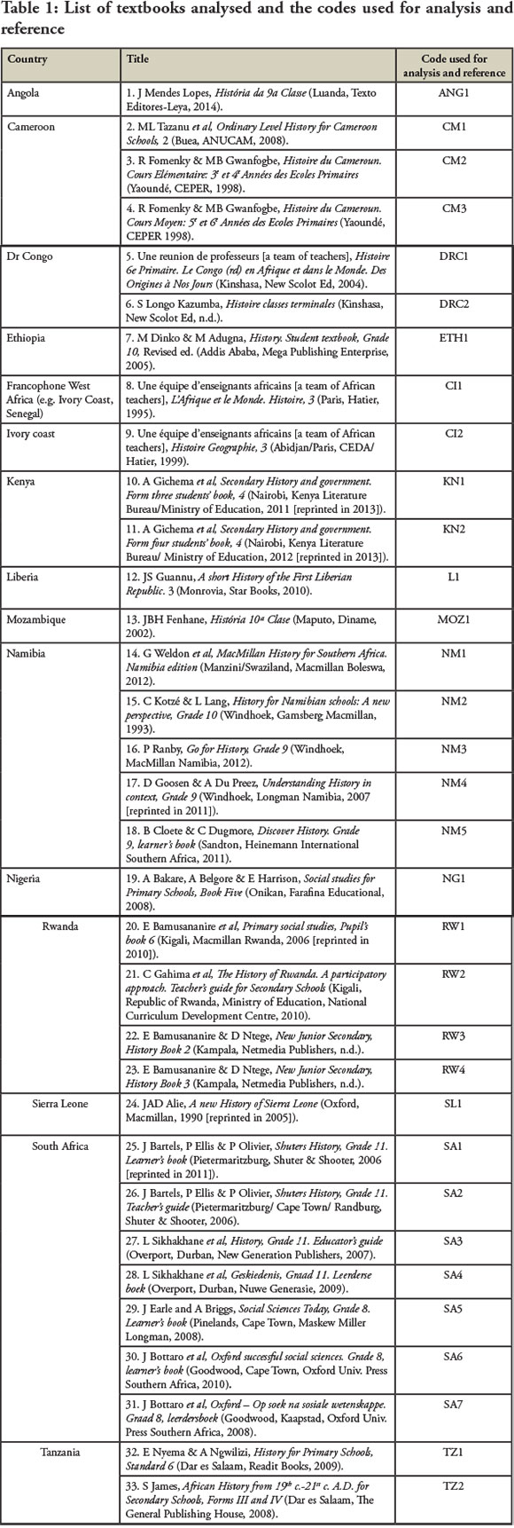 With an eye to being as inclusive and diverse as possible in terms of regional coverage, care was taken to include textbooks from countries in West, Central, East and Southern Africa which are former English, French, German, Belgian, Italian and Portuguese colonies, or which were never formally occupied and colonised by European powers, notably Liberia (Table 1). At least one textbook was analysed from each of the following countries:10