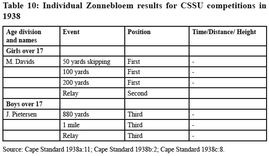 No Zonnebloem athletic results could be obtained for 1936, but members of the 1937 Zonnebloem athletics team are given here: (Boys) A Bavasah, F Murray, P Meyer, Petersen, J Damonzem, C Abrahams, Vries, S Levendal, R Oliver, W Williams, P Jansen and A Rorich; (Girls) J Titus and E Ahrends (UCT, MAD BC 636 D2.85). Individual Zonnebloem results for CSSU competitions in 1937 are presented in Table 9. These results may prove useful for later statistical purposes.