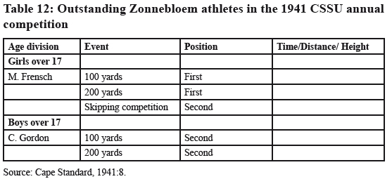 The year 1941 proved to be a successful athletics season for Zonnebloem in the CSSU annual competition. Zonnebloem Training School won the 1941 Diamond House Trophy6 at the Green Point Track on Friday 30 May. The school also won the senior Coronation Cup for most points in the under 17 and over 17 sections (Cape Standard 1941:8; Cape Standard 1942:10). The outstanding athletes of that meeting are presented in Table 12.