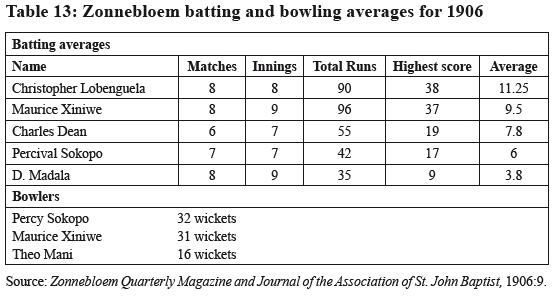 By 1906, Zonnebloem had their own cricket grounds but also played away matches. Two reports appeared in the college magazine that year. On 8 September they played against the Rhodesian Cricket Club and the following week against the St Augustine Club (Zonnebloem Quarterly Magazine and Journal of the Association of St. John Baptist, 1906:55). The College defeated the Rhodesians by 15 runs although they bowled badly. Against the St Augustine Club, they lost by 40 runs (Quarterly Magazine and Journal, 1906:55). To date no research could be found that has explored the historical background of the Rhodesian Club, but it is known that St Augustine Club was established in 1899 at the St Paul's Church in Cape Town under the direction of Canon (later Bishop) Lavis (Cleophas n.d.). That year of 1906 the cricket club released its batting and bowling averages, which is presented in Table 13.