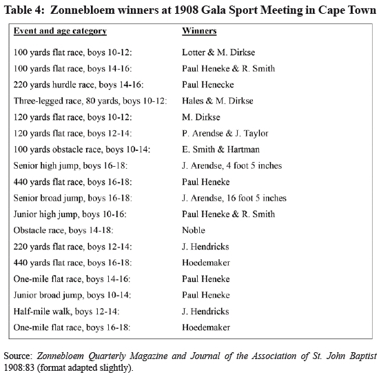 Mandell 1984:151). No results could however be found for this athletics meeting. The report in the Quarterly Magazine does however show to what extent British culture had infiltrated missionary school sport, especially in the after-celebrations. After the meeting, Mrs Parkhurst presented the prizes and was herself presented with a bouquet. Daniel Moshesh presented it and his remarks were followed by hearty and approving applauds. A musical programme was performed under the directorship of Michael Gaboutloeloe, who led the Bechuana choir in amusing the onlookers with choruses and comic items. The warden, Parkurst, urged the boys to keep up their athletics and congratulated them on their great success that day. Afterwards, G. van der Hoven and J. Moshesh were each presented with a gold-nib fountain pen for the trouble they had taken in arranging the sports. "God save the King" brought the evening to a close (Zonnebloem Quarterly Magazine and Journal of the Association of St. John Baptist 1904:10, 16-17).