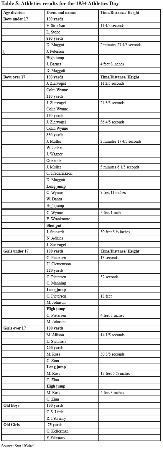 Also, in 1934, a series of athletic meetings was organised by the CSSU, of which only one result sheet could be traced (Table 7).