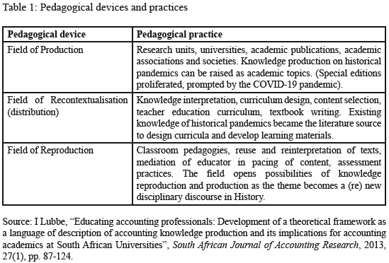 Bernstein's notion of the pedagogical device is employed in this article to integrate historical knowledge of pandemics into the Senior Phase History curriculum. Bernstein makes a distinction between what knowledge is relayed (the message) and an underlying pedagogic device that structures and organises the content and distribution of that knowledge.30 To this end, Bernstein identifies three main fields of the pedagogical device, namely knowledge production, recontexualisation and reproduction.31 In this proposal, the focus is on knowledge content selection by curriculum planners, the pedagogisation of the content as curriculum knowledge and texts, and the mediation of the curriculum at the classroom level. The focus is therefore on the recontextualising and reproduction fields. Bernstein thus places emphasis on an analysis of the production and reproduction of knowledge via official schooling institutions.