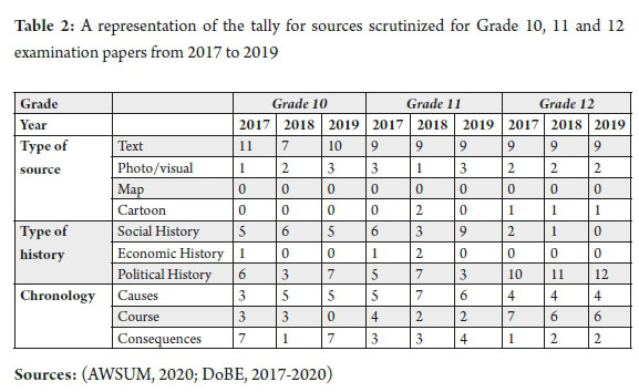 In this section, a tally of the sources found in the addenda of Grade 10 to 12 History examination papers from 2017 to 2019 is outlined and discussed. These papers were set by the DoBE as exemplars for Grades 10 and 11 and national exam papers for Grade 12. Table 2 differentiates the sources into different types, i.e. text, photo/visual, map or cartoon sources. It further differentiates types of history, i.e. political, social or economic history, as well as chronological sources, looking at causes, course or consequences of events.
