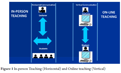 Danisch argues that Covid-19 has "made it easier to reduce teaching to knowledge dissemination and to obscure other, equally important, forms of education that help students to be better citizens, thinkers, writers and collaborators".21 All four of these forms of education resonate specifically with the history curriculum and skills that the history lecturer strives to inculcate to varying degrees. The transition was from in-person teaching, which we describe as a horizontal form of communication - from lecturer to students and students to students - to be replaced with what can be described as a vertical form of teaching - from lecturer to student. (See Figure 1)