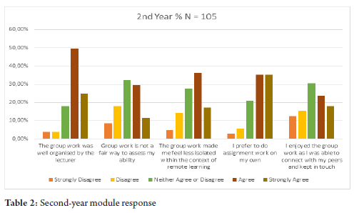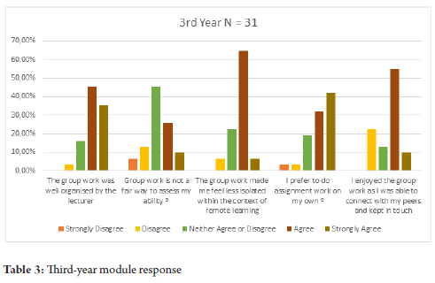 Over 80% of participants approved (strongly agree and agree) of how the group work was organised. However, although perceived as well organised, about 45% were unsure whether or not group work was a fair way of being assessed. More than 75% of students (strongly agree and agree) indicated that group work left them feeling less isolated in the context of online learning. However, like the first and second-year students, most students, almost 75% (strongly agree and agree), preferred to do individual history assignments. Yet 65% of the students enjoyed (strongly agree and agree) the group work experience. This was consistent with group work's role in the other history modules of different levels.