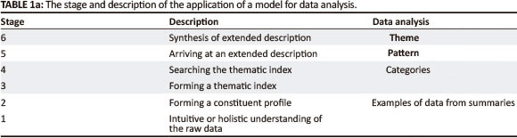 Data analysis was performed by application of the model for analysing phenomenological data designed by Holroyd (2001:3) (as adapted from Schweitzer's 1998 model, and outlined in the Appendix to this article). The model enhanced the explication of the meaning structures developed through the researched experience. During data analysis personal accounts were clearly followed up to establish how these linked to a complex set of group dynamics. The purpose was to take note of personal experiential accounts and to incorporate these with the interactional elements of the group experiences (Palmer et al. 2010:101). Excerpts used in presenting the data are expressions of individual or personal accounts. However, the interpretation of the findings is from the categories which were built from such excerpts and therefore representative of the group. The six steps of the model for analysing phenomenological data enhanced the data analysis process (Sadala & Adorno 2002:289).