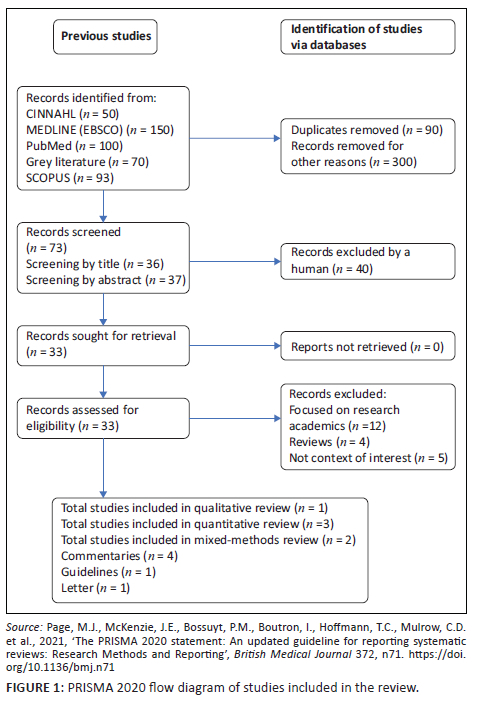 The review was guided by the Arksey and O'Malley (2005:1) scoping review framework, which has the following stages: (1) identifying the research question; (2) identifying relevant studies; (3) study selection; (4) charting the data; and (5) collating, summarising and reporting the results. The Preferred Reporting Items for Systematic Review and Meta-analysis Protocols (PRISMA-P) 2020 (Page et al. 2021:1) flow chart was utilised to report how the articles found from the search were sorted.
