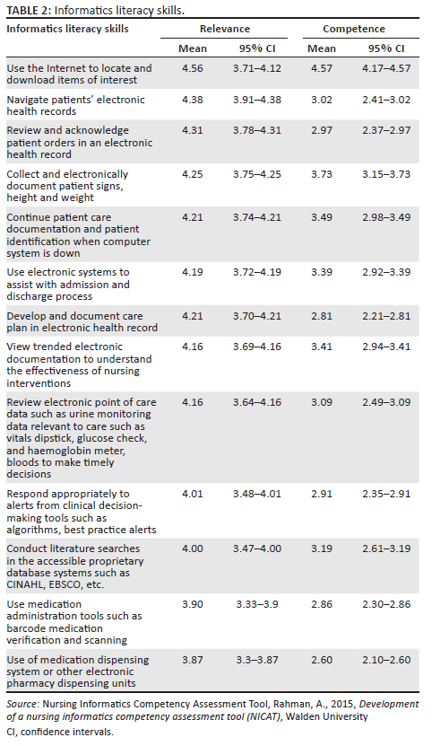 Although informatics literacy skills were rated the lowest, the highest rated informatics literacy skills were related to using the Internet. The respondents' involvement in the accessing of research findings, both in the educational and the clinical environment, the documenting of searches as a curriculum requirement in their educational programme, and the exposure to a variety of virtual tools and online environments such as eLearning within their educational programme, could have yielded a greater familiarity with the use of the Internet and Internet-related software and could have been a potential reason why their perceived relevance ratings for this skill were higher. Even so, it is significant to note that previous studies have reported that even though nursing students were frequent Internet users and using the Internet for almost all their study purposes, they had poor literacy skills with regard to the finding of credible and reliable information and were unable to evaluate high-quality from low-quality health resources on the Internet (Rathnayake & Senevirathna 2019), thus highlighting the complexity of informatics literacy skills.
