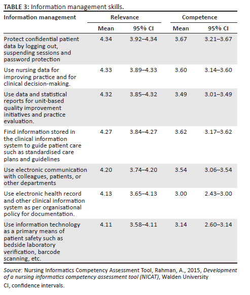 CONCLUSION: The study concluded that computer literacy skills, informatics literacy skills and information management skills were relevant to nursing practice, despite varying levels of competence in these skills among nurses