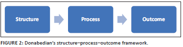 The Donabedian framework covers all relevant aspects of an organisation's structure, process, and outcome and their interrelations - hence its suitability for viewing or assessing an organisation, in this case, healthcare institutions (Donabedian 2005). For Donabedian, the structure is understood to be the attributes of material or human resources and organisational structure and includes the physical setting in which care takes place as well as the human resources, as represented by healthcare providers (Donabedian 1988, 2005).