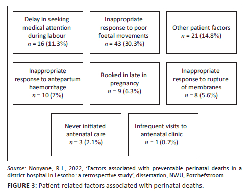 From these findings, it is clear that strategies to curb the occurrence of avoidable perinatal deaths should address patient-related, medical personnel and administrative related factors. Vallely et al. (2021) also recommend that perinatal deaths can be avoided through a package of interventions at both the facility and community levels. This package of interventions can include, for example, placing competent staff in maternity wards and educating pregnant women on danger signs and when to seek medical help. This study shows that in the context of a district hospital in Lesotho, the strategies should include health education to primigravidas regarding monitoring foetal movements and timely seeking medical help, equipping medical personnel to identify and respond to risks in time and ensuring that there is enough appropriate equipment available to manage emergencies.