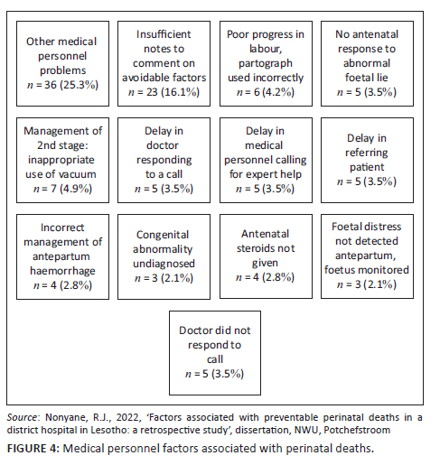 It is of concern that medical personnel problems associated with perinatal deaths such as failure to identify poor progress in labour where the partograph was incorrectly used as well as doctors' delay in seeking expert help, and doctors not responding to the call were observed, as these problems are high risks and avoidable. The problem of insufficient notes is also of concern, as inadequate recording derails effective auditing and consequent quality improvement initiatives (Rhoda et al. 2014). In addition, 'other' medical personnel problems were not specified, indicating a gap in recording, which limits effective auditing and future quality improvement initiatives (Nieuwoudt, Mackay & Mda 2022).