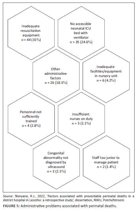 Of great significance is the inadequate resuscitation equipment, no accessible intensive care unit (ICU) bed with ventilator, and inadequate equipment in nursery unit as they are associated with multiple perinatal deaths. Once again, the limitation of 'other' administrative problems is observed, confirming the gap in recording and consequent limited auditing (Nieuwoudt et al. 2022).