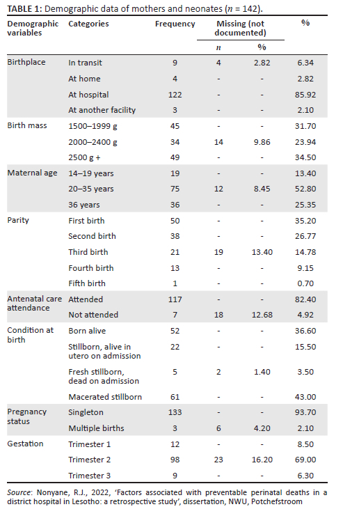 The population comprised all the obstetric records of a documented perinatal death for the period starting from January 2018 to December 2020. The study used an all-inclusive sampling of all records with documented stillbirths and perinatal deaths during the above-mentioned period. No participants were engaged, and the 142 records met the eligibility criteria of the study. The eligibility criteria entailed that only the following obstetric records were included: obstetric records of women who delivered in a district hospital in Lesotho from 01 January 2018 to December 2020 with a perinatal death documented in the obstetric record. The obstetric records of perinatal deaths that occurred 7 days or longer after birth were not included as the study focused only on the period when most deaths occur. Confidentiality of information and the process of obtaining permission to conduct the study and accessing the records are explained under 'Data collection' and 'Ethical considerations'.