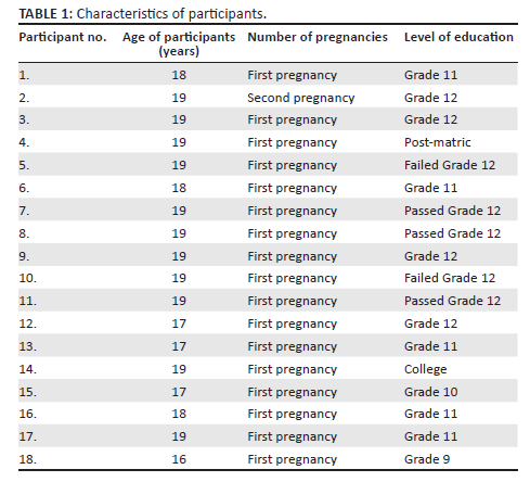 In total, 18 participants were interviewed. All the participants, ranging in age from 16 years to 19 years, had teenage pregnancies and are now mothers; the information offered includes their actual experiences. The participants' ages, number of pregnancies, and educational levels are shown in Table 1.