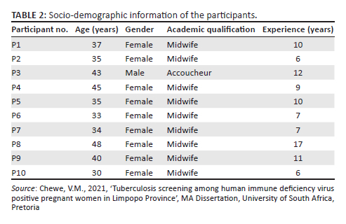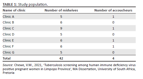 The Department of Health in the Limpopo province, Capricorn District, the University of South Africa, and the participating midwives are appreciated by the researchers for supporting this study. This article is partially based on the author's thesis entitled 'Tuberculosis screening among human immune deficiency virus positive pregnant women in Limpopo Province' towards the degree of Master of Arts in the Department of Health Studies, University of South Africa, South Africa on 15 December 2021, with supervisor Dr SH Khunou. It is available here: https://hdl.handle.net/10500/29111.