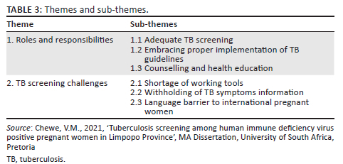 Roles and responsibilities and TB screening were the two primary themes that emerged as midwives' and accoucheur's experiences of TB screening among pregnant women. Forty-five emergent codes led to the themes and sub-themes. Subsequent sections detail each theme. In Table 3, the themes and sub-themes are described.