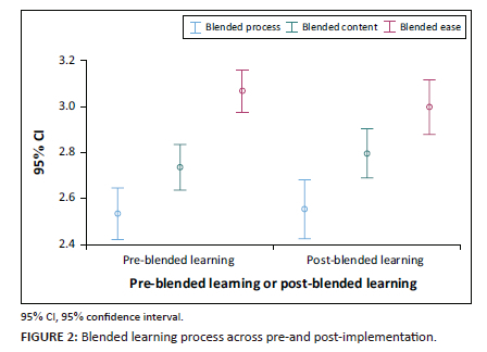 The ease of use was measured in terms of the use of the learning management system, and this had high levels of agreement of the ease of use of the learning management system, pre- and post-implementation. However, concerns were expressed regarding self-perceived knowledge limitations compared to peers (pre-group 2.34, ± 1.36; post-group 1.93, ± 1.34) pre the module, which reduced significantly post-implementation. This suggests a potential gap in students' confidence and online competence prior to the implementation of blended learning, which can play an important role in effectively using an online learning management system (Nwamu & Ni 2023; Singh et al. 2021). This also highlights the importance of ongoing support and training initiatives (Rasheed, Kamsin & Abdullah 2020; Siraj & Maskari 2019) prior to implementing blended learning. Training and preparation to ensure students have necessary skills and knowledge to sidestep difficulties, as was done in this study, can enhance the overall experience of using blended learning (Divjak et al. 2022; Khan et al. 2021; Singh et al. 2021). Other recommendations for training should also include accessible support materials (Langegård et al. 2021; Mukasa et al. 2021; Singh et al. 2021), and interactive online learning community where students can exchange experiences and assist each other to navigate the platform to create confidence and friendships (Divjak et al. 2022; Langegård et al. 2021; Singh et al. 2021). By combining these strategies, the perception of online learning management systems among students can improve, resulting in a more enjoyable experience.