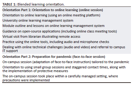 In response to the global pandemic, a blended education approach was implemented with third-year nursing students enrolled in a community health module, by including online teaching to prioritise the safety of students. The aim was to balance face-to-face and online learning interactions to minimise in-person contact and mitigate the risk of COVID-19 transmission. Blended learning was implemented from February to June 2021. To ensure a smooth transition, students underwent a 1-week blended learning orientation at the beginning of the semester (February 2021). The orientation covered the fundamentals of the blended learning approach and its application in the module, emphasising how this approach would support student learning under the circumstances at that time (Table 1).