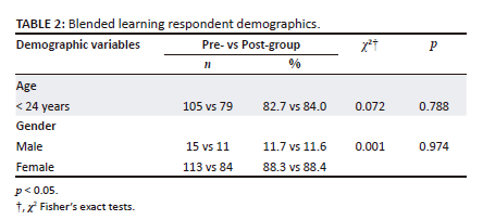 Data were captured and analysed in SPSS v28.0 (IBM Corporation, Armonk, New York, US). Students' perceptions of the three domains were analysed using means and standard deviations as per scale instructions for each of the domains and for the individual items. When analysing the responses of individual items in the questionnaire, a mean score of 2 was used as a reference value to analyse perceptions. A score of 2 or more for an item was regarded as positive, while less than 2 was considered negative (Shantakumari & Sajith 2015). Statements that were negatively phrased were reversed. The overall scale had a maximum attainable score of 96, with higher scores meaning more positive perceptions. Perceptions were classified into three categories that reflect the extent of the positive perceptions related to blended learning: 28-53, i.e. relatively low level of positive perceptions, possibly indicating reservations or concerns; 54-80, i.e. moderate to high levels of positive perceptions, possibly finding value in blended learning and > 80, reflecting a high level of positive perceptions and possibly strong endorsement and satisfaction (Shantakumari & Sajith 2015). Independent samples Chi-squared tests were performed to determine differences between pre- and post-survey demographics. Independent samples Mann-Whitney U tests were performed to determine whether there were differences in the mean scores of the students' perception of blended learning pre and post-implementation of the module. The significance level was set as p < 0.05.