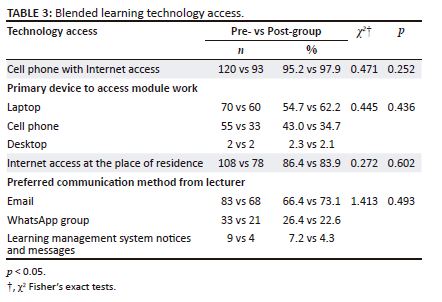 The study investigated nursing students' perceptions in using a blended learning approach during the pandemic implemented in a specific module. Blended learning was evaluated against three domains, the process of implementation, the content delivered via blended learning and the ease of use. In general, there was a positive perception towards the implementation and use of blended learning among respondents, which increased post-implementation with respondents still preferring blended learning after the module, with an increase (pre-group 86, 68.8%; post-group 75, 78.9%). This is consistent with other studies' findings, which support the general favourable opinion of blended learning (Khan et al. 2021; Langegård et al. 2021; Lu 2021). The strong technology foundation is evident in the high number of respondents indicating access to cell phones and Internet connectivity with a preference for e-mail communication.