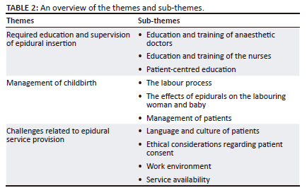 As the interviews progressed, a few emerging themes arose. These themes were then reflected upon by the first author, using an iterative process. The following themes were found to be predominant: required education and supervision of epidural insertion, management of childbirth and challenges related to epidural service provision. The outline of the themes and sub-themes is summarised in Table 2.